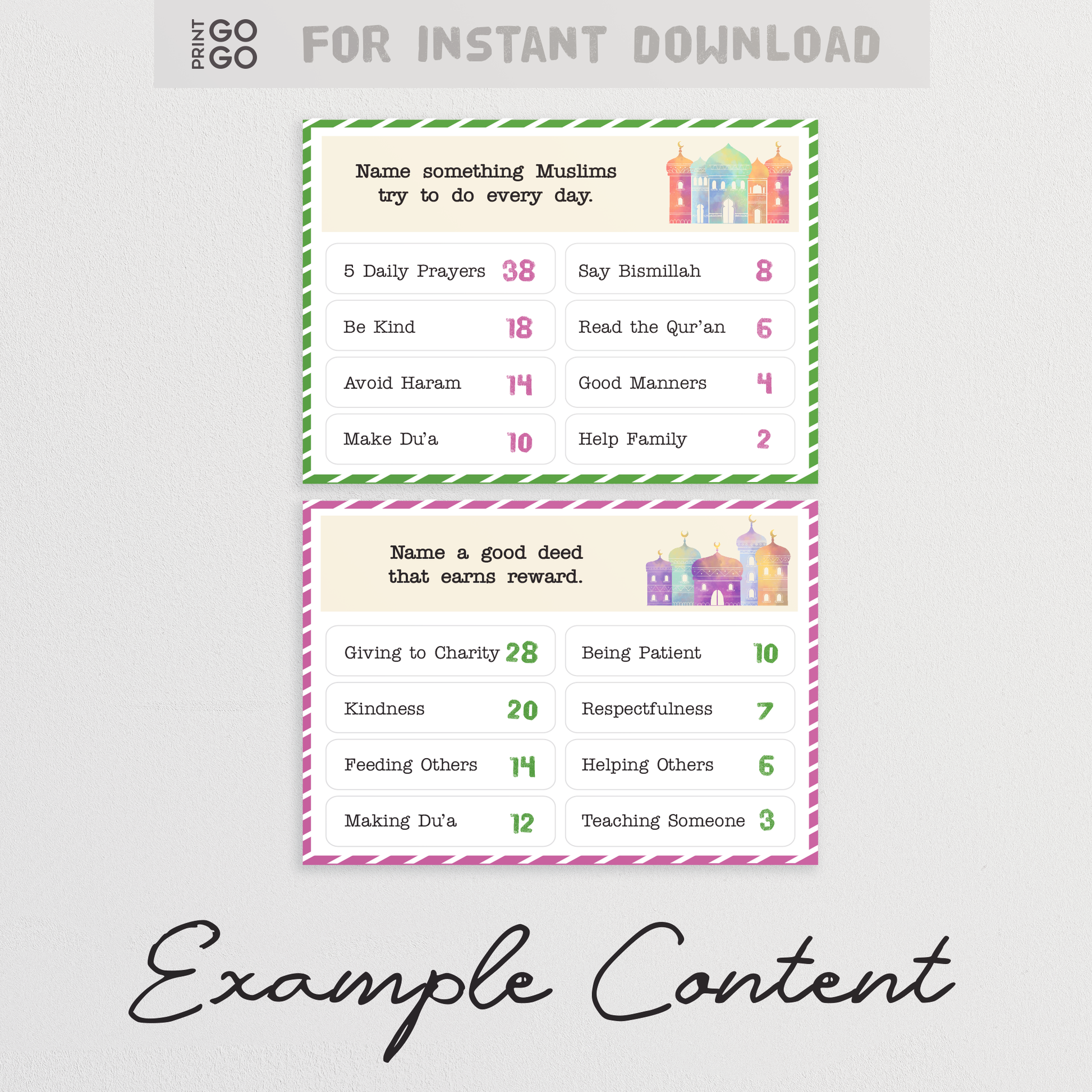 This group party game comes with all the materials for two complete games of competition, with 18 family-friendly Ramadan themed questions. Faith is a team sport so let's play!